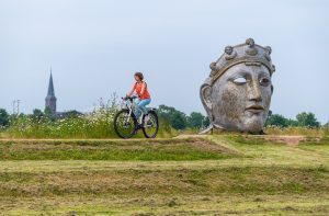 Fietser bij het Gezicht van Nijmegen. Gigantisch Romeins masker, gemaakt door kunstenaar Andreas Hetfeld. Op het Stadseiland. Via Romana étappe Nijmegen - Beek, grensoverschrijdende fietsroute.